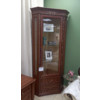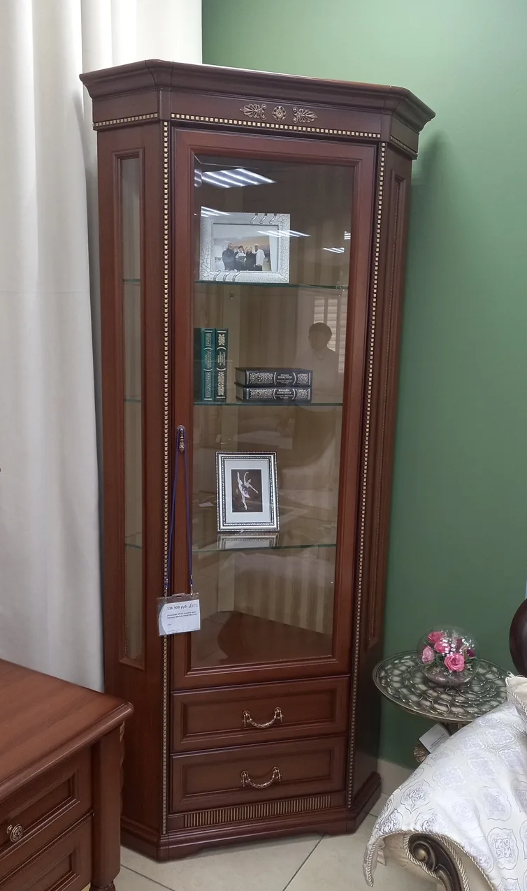 Шкаф угловой предназначен для хранения посуды и столовых принадлежностей. Мебель выполнена в цвете орех с отделкой легкой патиной. Задняя стенка шкафа драпирована тканью и обустроена внутренней подсветкой. Застекленные боковые стенки шкафа создают ощущение легкости. Фасад витрины декорирован резными накладными элементами. Верхняя дверь со стеклом, нижняя дверь-имитация ящиков, внизу отделение с полкой. Размер: 978*658*2149ммКлассическая мебель никогда не утратит своей актуальности. Для изготовления этой мебели используются только высококачественные материалы.