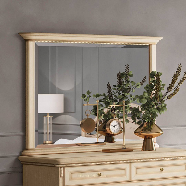 Карниз зеркала декорирован резным накладным элементом. По периметру зеркало украшено фацетом.