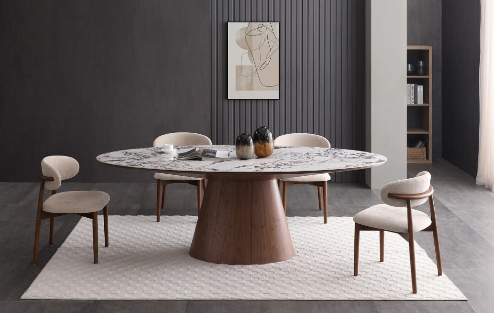 Ножка: МДФ в натуральном шпон ореха.*Arabescato — мрамор, который сочетает в себе отличные эксплуатационные характеристики и привлекательный внешний вид. Название "Арабескато" происходит от термина "арабеска", который обозначает общеизвестный декоративный стиль. Визитная карточка мрамора Arabescato — неповторимые узоры, сформированные темными прожилками разной толщины на основном белом или светло-сером фоне. Рисунок этот дизайнеры называют часто «каменными венами» — он образован трещинами, заполненными природными примесями.